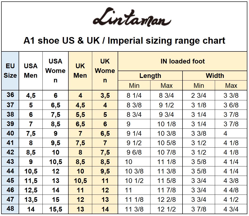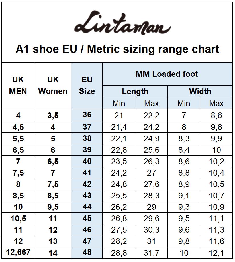 - Which size is for me? Please use the sizing table and look predominantly at your foot width to choose your Lintaman shoe size.