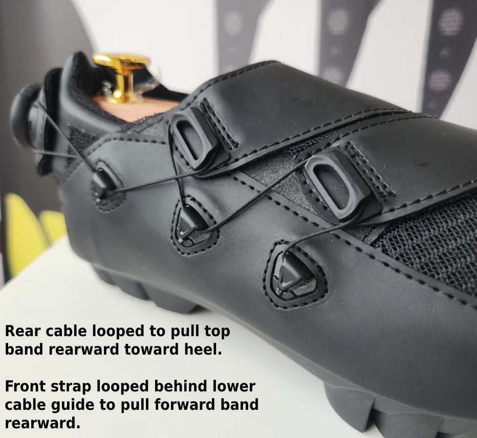 The front strap can be pulled more rearward by looping that cable behind the hook of the cable guide on the side o the shoe. It can be pulled downward by looping the cable around the front of that same side guide.