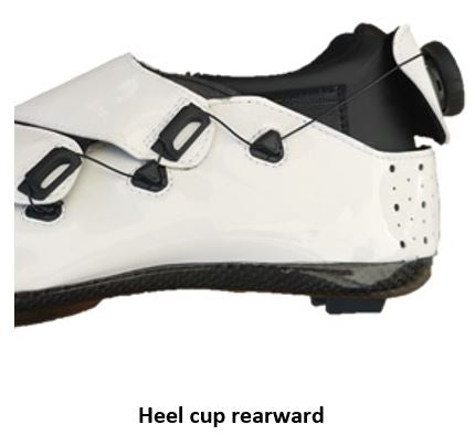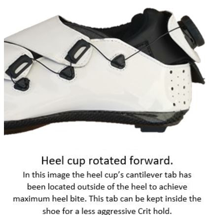 Heel angle options: The A1 shoe's heel angle can be adjusted forwards or upwards for an optimal fit to your heel position and shape. Beyond just allowing for rotation to suit your heel shape, the adjustable heel cup's lower tab can be cantilevered outside of the shoe for an even stronger grasp if so desired (left),